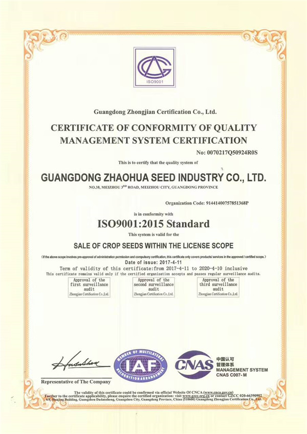 热烈祝贺广东兆华种业有限公司顺利通过ISO9001质量体系认证!
